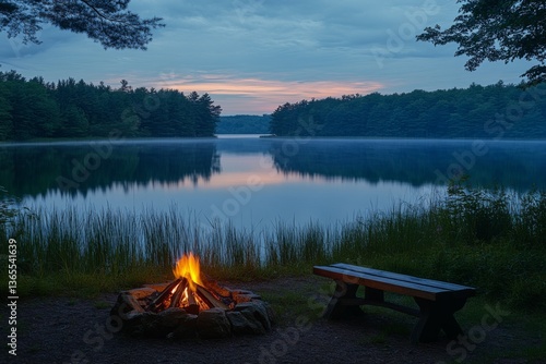 Peaceful lakeside campfire surrounded by trees under blue twilight sky