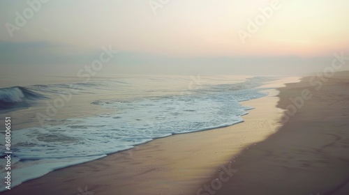 Peaceful morning on a deserted beach with soft waves and a clear sky transitioning from night to day