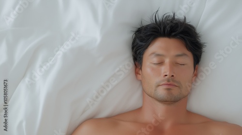 Peaceful resting man on white bedding in relaxing pose, featuring calm expression and tranquil atmosphere