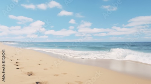 Peaceful sandy beach under a clear sky with footprints leading to the ocean