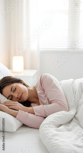 Peaceful Sleep Woman Resting in Cozy Bed Healthy Relaxation Comfortable Bedroom Serene Morning Sweet Dreams Restful Night Tranquil Scene