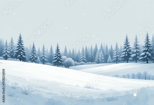 Peaceful snow covered winter landscape with frosted pine trees under soft snowfall