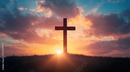 Peaceful Sunset Horizon with Cross Silhouette on Tranquil Hill : Generative AI