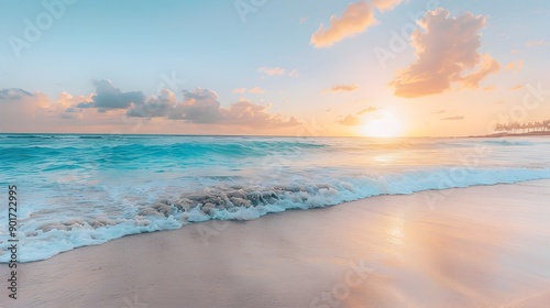 Peaceful Sunset on Serene Tropical Beach with Gentle Ocean Waves Lapping at the Shore