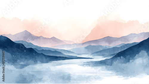 Peaceful Watercolor Mountain Landscape with Soft Misty Layers