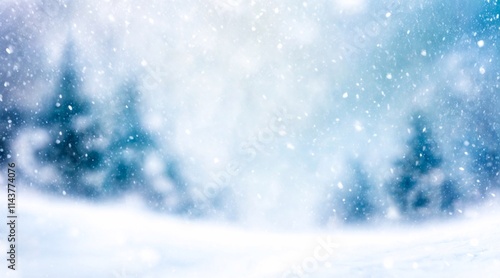 Peaceful winter scene with snow covered trees and sky filled with falling snow