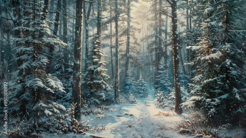 Peaceful winter woods with powdery snow and soft rustling branches background