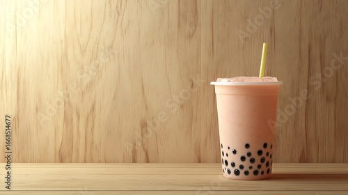 Peach Bubble Tea with Tapioca Pearls and Yellow Straw on Wood Surface