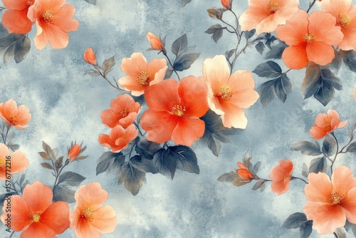 Peach colored flowers with leaves on blue textured background. This image is great for stationary, crafts, invitations, and greetings.