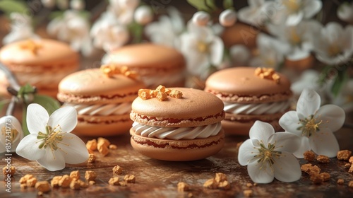 Peach macarons topped with orange zest, surrounded by white blossoms