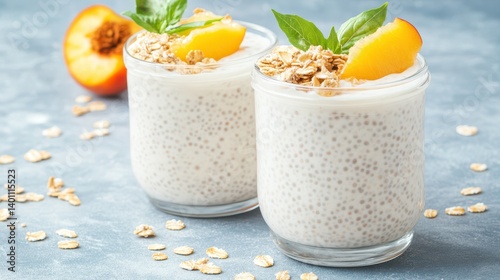 Peach Parfait Delight: A close-up view of two elegant glasses of peach parfait, their creamy texture and fresh.