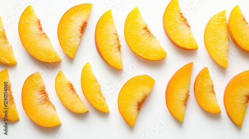 Peach slices line up on a clean white background, showcasing their vibrant color