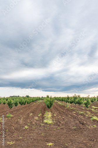 Peach tree, branch with small immature peaches . Peach farm in early summer . Unripe peach