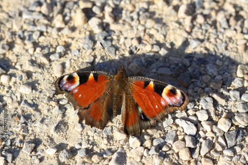 Peacock butterfly Inachis io on a path