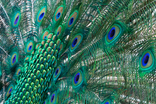 Peacock colored plumage. Colourful feathers. Mating techniques. tropical birds