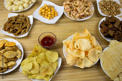 Peanut, Snack, nut, potato chips on a plate. Wooden table. Salty food for beer
