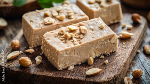 Peanut-topped halva slices on a wooden platter.