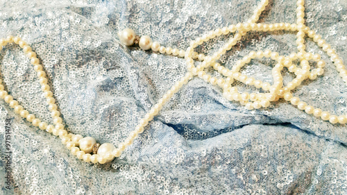 Pearl decoration on shiny blue fabric. Fashion background design, photography. Textile, fabric template, modern new