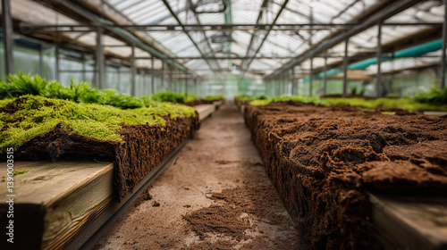 Peat moss moisture retention photography captures greenhouse vitality, highlighting sustainable growth and natural resource management.