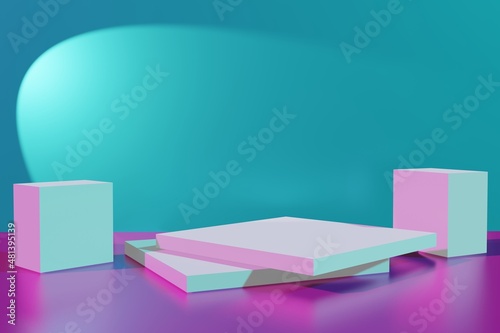 Pedestal display on pink background with box stand concept. Podium for brand promotion product, 3d digital render realisti