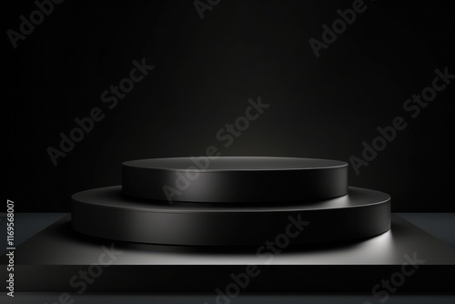 Pedestal Display Stand for Blank Product on Dark Background with Long Platform. Black Racked Dais for Exhibition or Studio Backdrop in 3D