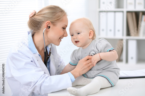 Pediatrician is taking care of baby in hospital. Little girl is being examine by doctor with stethoscope. Health care, insurance and help concept.