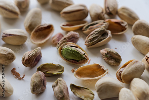 Peeled and whole pistachio nuts arranged together on clean white backdrop.