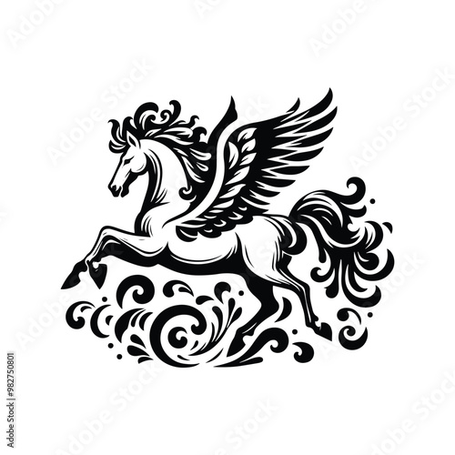 pegasus with victorian flourish decoration in black and white illustrations, cutout graphic
