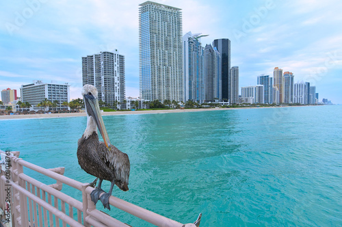 Pelican on pier in front of Sunny isles beach (Florida, USA) during cloudy winter evening