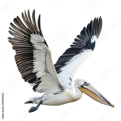 Pelican soaring gracefully over a coastal landscape with extended wings and striking plumage