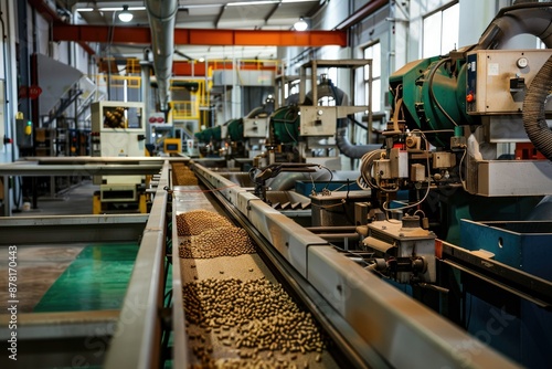 Pellet Production Line A bustling factory assembly line with machines forming and packaging animal feed pellets