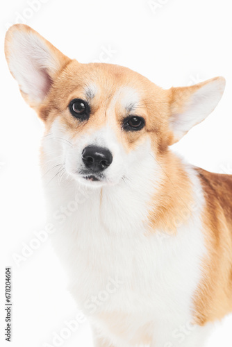 Pembroke Welsh Corgi portrait isolated on white studio background with copy space, purebred dog