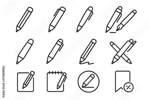 Pen and pencil line icon set. Writing, drawing, and editing symbols. Minimal outline vector icons for web, apps, and documents. Edit, write, sign, and note concepts.
