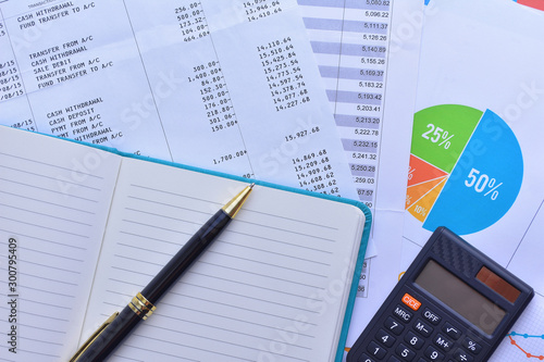 Pen, calculator and account reports. Business and finance concepts