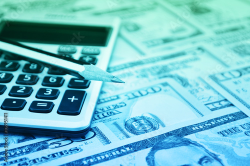 Pencil and calculator on dollar bank note money, Finance concept