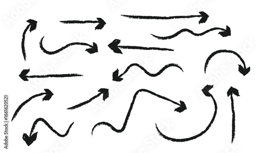Pencil chalk arrow scribbles collection - doodle pointers, curved lines, round swirls hand drawn. Chaotic artistic strokes, marker design elements set. Sketchy black outline drawings vector pack.