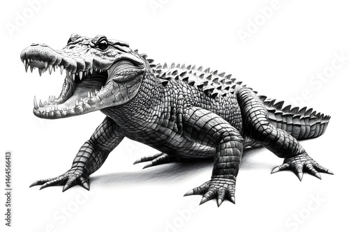 Pencil drawing of an angry, fierce and vicious crocodile, showing its fangs from a side view, white background