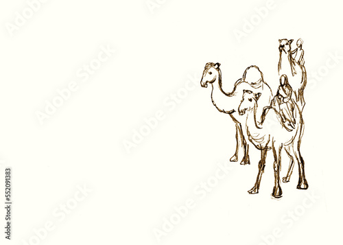 Pencil drawing scene. Camel settlers