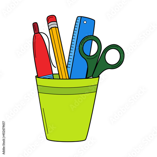 Pencil holder with a ruler, scissors, pen, pencil. Doodle style. Hand-drawn Colorful vector illustration. The design elements are isolated on a white background.