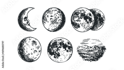 Pencil sketch collection of crescent and full moon phases on transparent background. Vector hand drawn illustration
