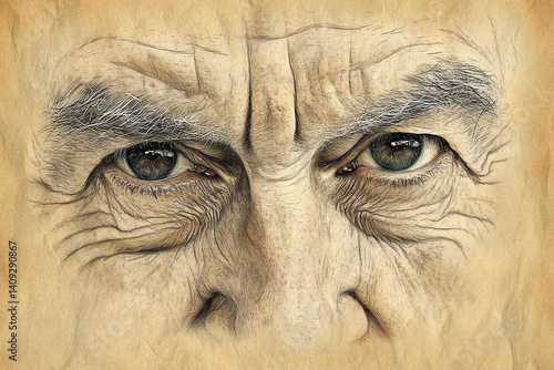 Pencil sketch portrait of elderly man with detailed wrinkles and expressive eyes on textured paper