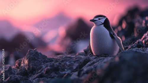 Penguin on rocky terrain at sunset with pink sky and distant mountains. Wildlife photography and serene nature concept