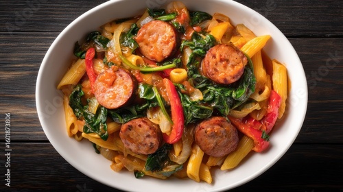 Penne pasta dish with sliced sausage, spinach, bell peppers and onions in a white bowl