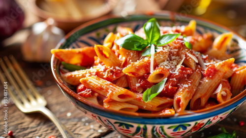 Penne pasta in spicy arrabbiata sauce with tomatoes, garlic, chili flakes, and fresh basil