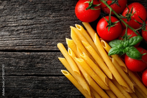 Penne pasta with fresh cherry tomatoes on rustic wooden background