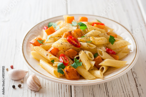 Penne pasta with pumpkin, chilli and parsley in plate on white wooden background