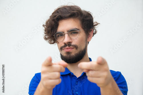 Pensive friendly attractive guy wearing glasses, pointing fingers at camera. Handsome bearded young man in blue casual t-shirt posing isolated over white background. We need you concept