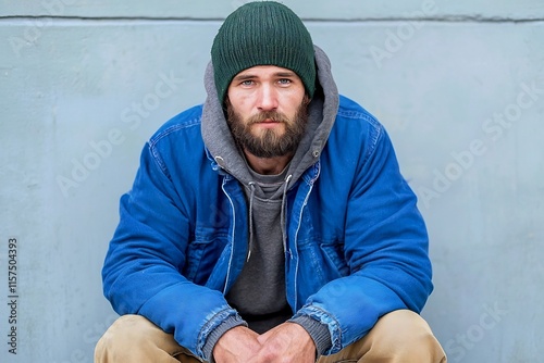 Pensive man in blue jacket and beanie sitting alone on urban street in winter