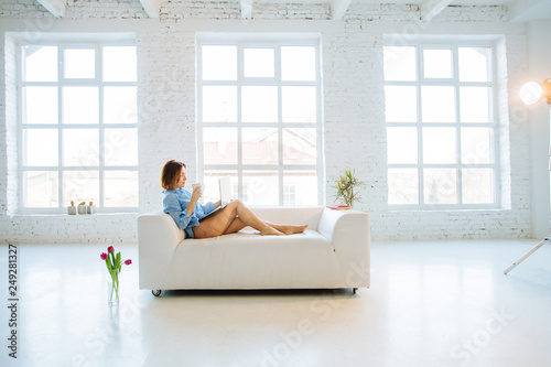 Pensive mature female freelancer drinking coffee and start working. Woman sitting on white sofa, holding cup, using laptop before three big window in white empty interior. Freelance ffreedom concept