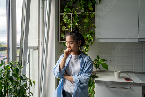 Pensive millennial Asian girl looking out window thinking about life problems, feeling anxious, lonely female at home dealing with breakup depression. Worried woman pondering before making decision